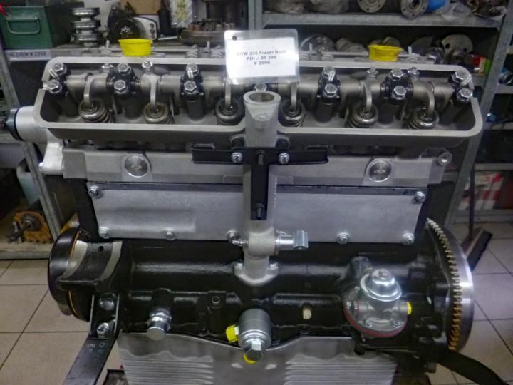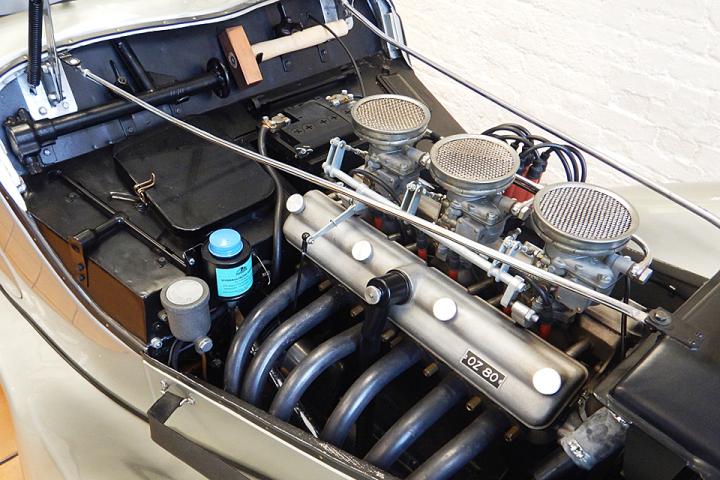 The 328’s six-cylinder engine featured an ingenious new cylinder head, designed by Rudolf Schleicher, which incorporated hemispherical combustion chambers and inclined valves without recourse to overhead, or twin camshafts. Instead, the engine’s single, block-mounted camshaft and pushrod valve actuation were retained. Two rocker shafts were employed, one situated above each bank of valves making the engine look like a twin-overhead-cam design. Down-draught inlet ports contributed to the motor’s efficient breathing.