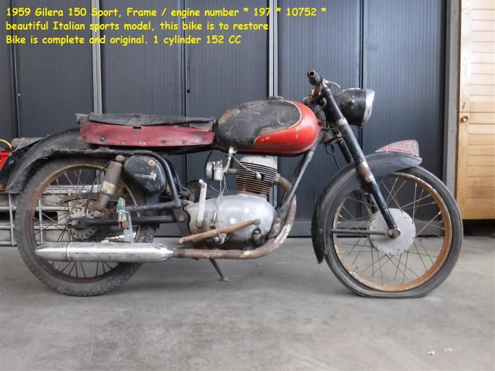 1959 Gilera 150 SportFrame motor nummer *197*10752* Mooi Italiaans sportmodel om te restaureren. Motor is compleet en origineel. 1 cilinder 152 CC Grootste keus in ECHTE klassiekers met meer dan 450 stuks in "de Stolze Collectie", van project tot perfect !